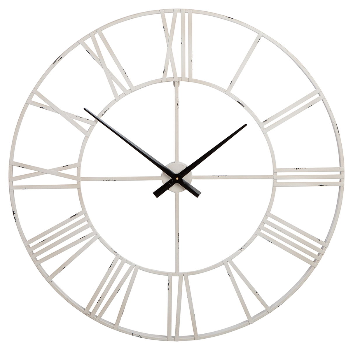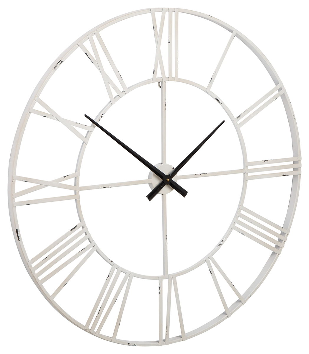 Casual style meets practical function with this wall clock. Roman numerals are easy to read on the sleek metal frame in an antiqued white finish. Keeping track of time has never been so stylish. Product Features Metal frame Antiqued white finish Roman numerals Keyhole bracket for hanging